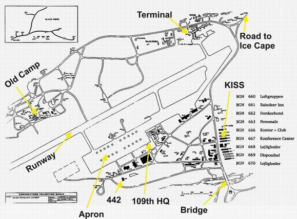 These three names all means the same. Sondy is an old military base started as a landing point between USA and Europe, during 2. World War. Used for shipping of warplanes to Europe and bringing wounded soldiers back to the US. The weather in Sondy is special, because the airport is only closed 4days a year. That is a lot less then in Thule in the north and Narssauaq in south. The military part of the base was disbanded in 1992. Since WW2 till 1992 the base was divided in to a Danish and American site. You needed a ID card to have access to the American site....this was a military base. Back in the good old days, there was more or less no crime in Sondy, everything was run by the military, and no one wants to get in trouble with them. But since 1992, when Sondy once again was open to everybody, and the military was pulled out, drunk native people started to show in the dust streets. This map below shows the layout of the base. |